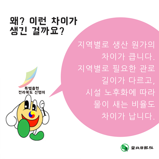 "지역별로 생산 원가의 차이가 큽니다. 지역별로 필요한 관로 길이가 다르고, 시설 노후화에 따라 물이 새는 비율도 차이가 납니다."