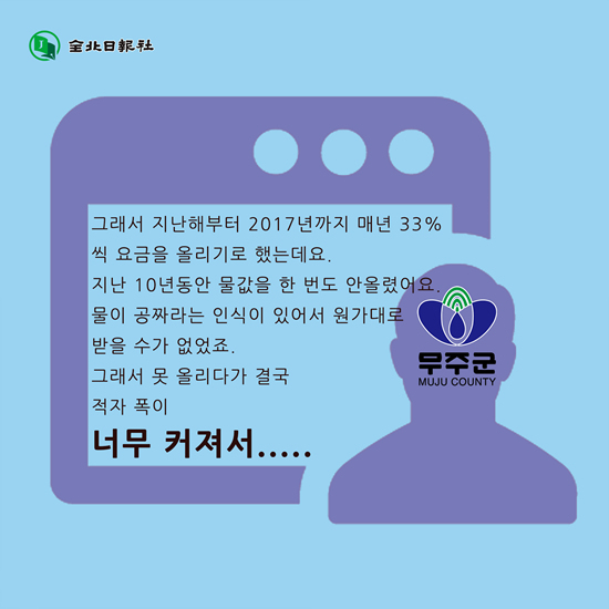 무주군 관계자 "그래서 지난해부터 2017년까지 매년 33%씩 요금을 올리기로 했는데요. 지난 10년동안 물값을 한 번도 안올렸어요. 물이 공짜라는 인식이 있어서 원가대로 받을 수가 없었죠. 그래서 못 올리다가 결국 적자 폭이 너무 커져서..."
