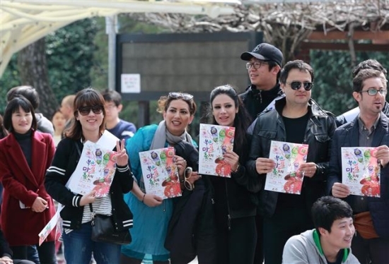 ▲ 외국인들이 오는 5월 6일부터 열리는 제4회 부안마실축제 홍보를 위해 팸플릿을 들고 기념촬영을 하고 있다.