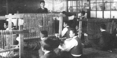 ▲ 1932년 백산공립보통학교가 발간한 앨범에 수록된 사진으로 일제시대 일본인 아베 교장이 학생에게 가마니 짜는 법을 지도하고 있다.