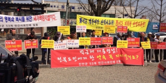 지난 1일 오전 10시께 (사)진안군애향운동본부(본부장 원봉진)를 중심으로 한 진안 관내 53개 사회단체연합회는 전주시 풍남동 새누리당 전북당사 앞에서 ‘지덕권 산림치유원 조성’이 국가사업으로 집행되지 않는 것에 대한 항의 집회를 열고 성명서를 발표했다.