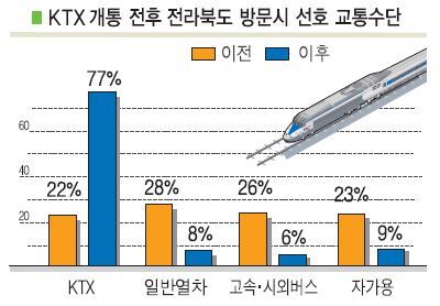 지난해 4월 호남 KTX 개통 이후 일반철도와 고속버스 및 시외버스의 이용객은 줄어든 반면, KTX 이용객은 늘어난 것으로 나타났다. 또 KTX 이용 외지인의 방문 목적은 업무·출장 비율이 높았으며, 이들은 평균 14만1000원을 전북에서 쓴 것으로 조사됐다.