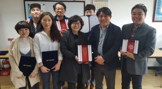 ▲ 극단 까치동 전춘근 대표(앞줄 왼쪽 세 번째)와 정두영 전북연극협회 회장(앞줄 왼쪽 네 번째) 등이 제32회 전북연극제 시상식을 마치고 기념촬영을 하고 있다.