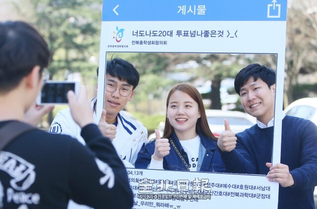제20대 국회의원 선거를 앞두고 대학생의 투표 참여를 독려하는 캠페인이 열린 5일 전주대학교에서 캠페인에 참가한 학생들이 인증 사진을 찍고 있다.