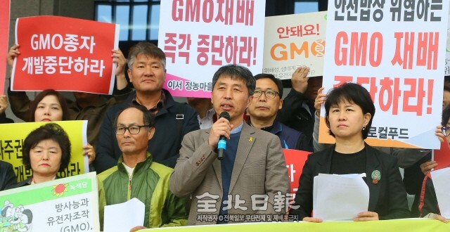 상용화 반대 전북도민행동 회원들이 7일 전북도청 앞에서 기자회견을 갖고 농촌진흥청의 유전자변형 벼 상용화와 유전자변형 작물 개발 중단을 촉구했다.