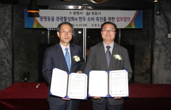 정읍시 양심묵 부시장과 광명시 이춘표 부시장은 지난 7일 광명와인동굴에서 ‘광명동굴 관광활성화와 한우 소비촉진을 위한 업무협약’을 체결했다.