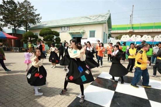 ▲ 지난 2일 익산 춘포역에서 열린 ‘근대문화유산 박물관 춘포’행사에 참가한 시민들이 옛 교복을 입고 율동을 하고 있다.