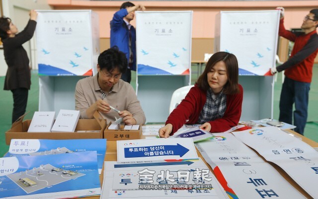 제20대 국회의원선거를 하루 앞둔 12일 전주시 중화산 2동 제3투표소인 전주근영여고 강당에서 선관위 관계자들이 투표소를 설치하며 선거를 준비하고 있다.