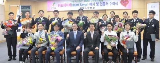 이번 하트 세이버 배지와 인증서는 지난 2월 자택에서 갑자기 의식이 없고 맥박이 없어진 환자를 심폐소생술과 자동제세동기(AED)를 사용해 소생시킨 소방공무원 45명과 일반인 2명, 경찰 1명, 의무소방 7명을 포함한 55명에게 수여됐다.