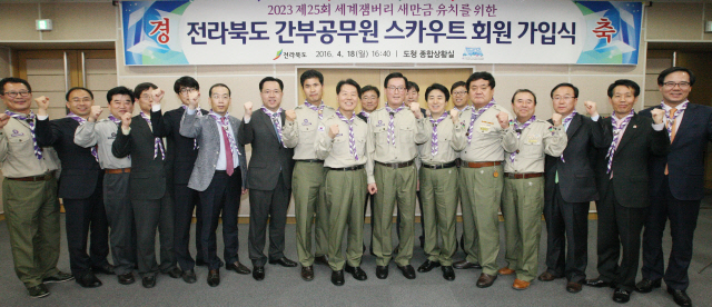 전북도가 송하진 도지사에 이어 김일재 행정부지사와 이형규 정무부지사가 한국스카우트 평생회원에 가입하는 등 ‘2023 세계잼버리’ 새만금 유치성공을 위한 의지를 다졌다.