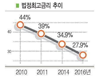 법정최고금리는 2007년 49%, 2010년 44%, 2011년 39%, 2014년 34.9%로 낮아졌다.