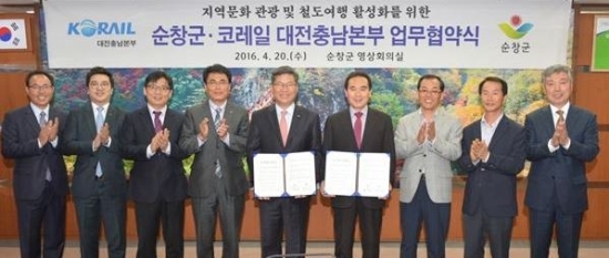 황 군수는 협약식에서 “순창은 한국관광 100선에 선정된 강천산을 비롯해 섬진강 등 많은 관광자원을 가지고 있다”며 “이번 업무협약이 다양한 기차여행상품 개발을 통한 대전 충남지역 관광객 유치에 발판이 되기를 기대한다”고 말했다.