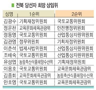 25일 전북일보가 4·13 20대 총선 전북지역 당선자들을 대상으로 희망 상임위원회를 전화 조사한 결과, 10명의 당선자 중 4명(정동영·조배숙·이용호·안호영)이 국토교통위원회(국토위)를 희망했다.
