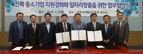 전북경제통상진흥원(원장 홍용웅)과 중소기업진흥공단 전북지역본부(본부장 전원찬)·전북서부지부(지부장 최규홍)는 2일 오전 11시께 전북경제통상진흥원 회의실에서 ‘전북 중소기업 지원강화와 일자리창출을 위한 업무협약’을 체결했다.
