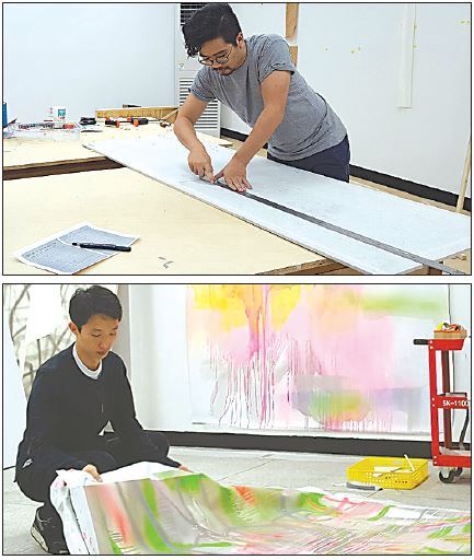 ▲ 16일 완주 상관면 도립미술관 창작스튜디오에서 이르판 헨드리안(위) 작가와 박성수 작가가 작업을 하고 있다.