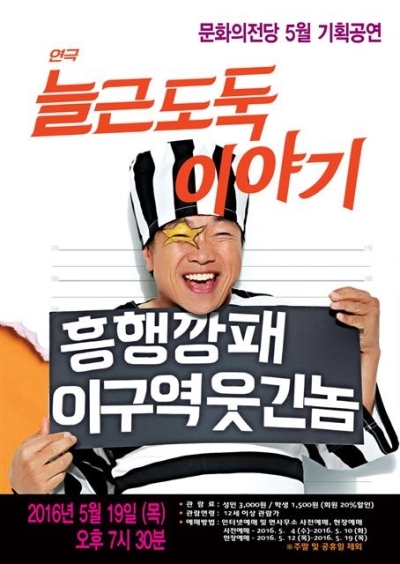 ‘늘근도둑이야기’는 소극장 특유의 장점을 잘 살린 작품으로 현시대를 유쾌하게 풍자하면서 배우들의 입담과 열연이 더해져 관객들의 뜨거운 호평을 이어가고 있는 국가대표 시사코미디 연극이다.