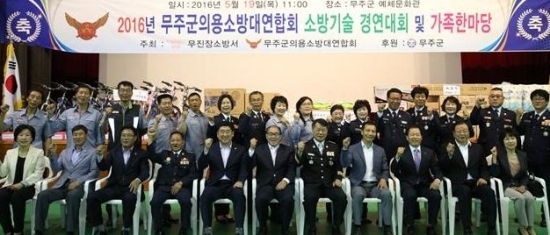 ▲ 19일 무주읍 예체문화관에서 무주의용소방대 소방기술경연대회가 열려 참석자들이 기념 촬영을 하고 있다.