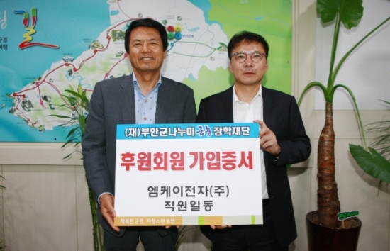 엠케이 전자 주식회사 허상희 대표를 비롯해 직원 50명이 부안군 나누미근농장학재단 정기 후원회원에 가입하고 지난달 27일 부안군청을 방문해 가입증서 전달식을 개최했다.