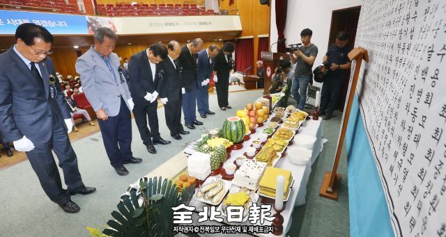 호국보훈의 달을 맞아 호국영령 합동 추모식이 열린 1일 전주시청 강당에서 보훈단체 관계자들이 호국영령의 넋을 기리며 묵념하고 있다.