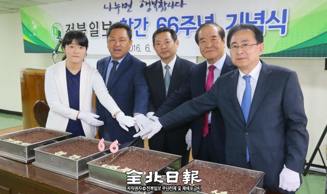 1일 전북일보 창간 66주년 기념식이 열린 전북일보사 7층 회의실에서 서창훈 회장(가운데)과 윤석정 사장(오른쪽에서 두번째) 등 임직원들이 기념 떡 케이크를 자르고 있다.