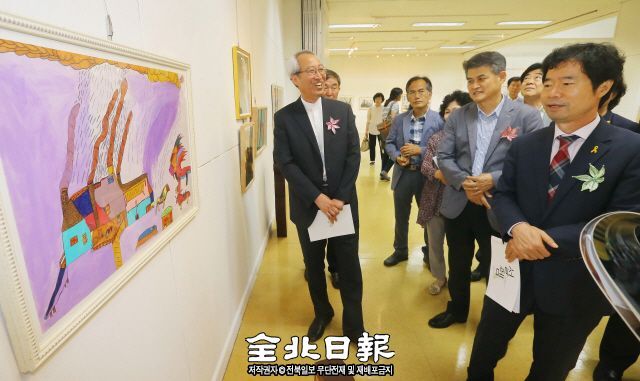 발달장애 청소년 작가들의 작품 전시회가 열린 7일 전북교육문화회관 전시실에서 개막식에 참석한 김승환 교육감(오른쪽 첫 번째)이 작품을 감상하고 있다.