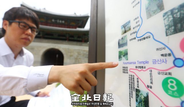 외국인들이 많이 오가는 전주시 풍남문 앞에 설치된 관광지도 안내판에는 ‘Keumsansa Temple 금산사’라는 문구가 적혀 있다. 공식 영어 번역문은 ‘Geumsansa Temple 금산사’로 표기돼야 하지만 잘못 적힌 것이다.