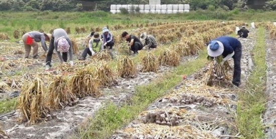 화산면 직원 10여명도 이날 화산면 종리 용수마을의 다문화가정을 찾아 마늘수확 일손돕기를 실시했다.