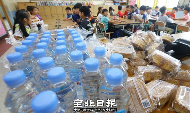 ▲ 전국학교비정규직노조 전북지부가 총파업 결의대회를 진행한 9일 파업으로 인해 도내 일부학교에서 학교급식이 중단된 가운데 전주시의 한 초등학교에서 급식을 대신해 도시락을 지참하거나 빵과 생수로 급식을 대신하고 있다. 박형민 기자