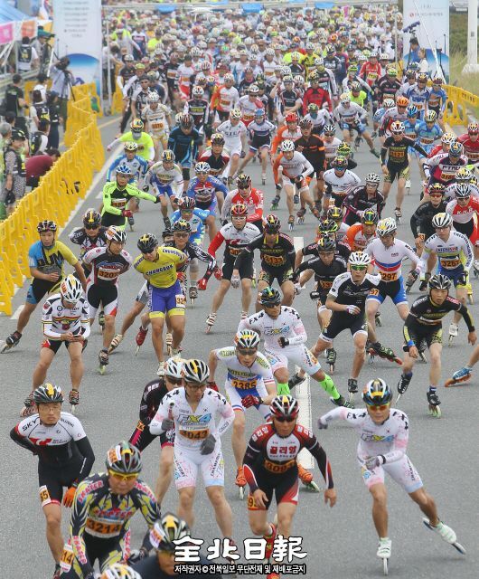 제2회 새만금 전국인라인마라톤대회가 열린 12일 새만금 방조제에서 스타트 라인을 출발한 참가 선수들이 질주하고 있다.