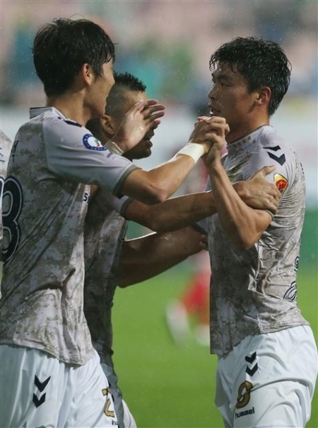▲ 15일 오후 전주월드컵경기장에서 열린 현대오일뱅크 K리그 클래식 2016 전북현대와 수원 삼성의 경기에서 전북현대 이종호가 극장골을 넣고 동료와 기뻐하고 있다. 연합뉴스