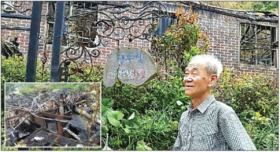 ▲ 불에 타 벽만 남은 화실 앞에 선 윤명호 화백.