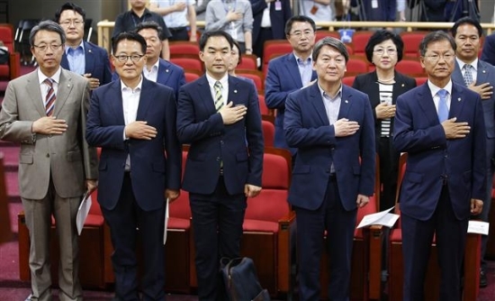 ▲ 국민의당 안철수 상임공동대표와 천정배 공동대표, 박지원 원내대표, 김성식 정책위의장이 15일 오후 국회에서 채이배 의원 주최로 열린 소비자집단소송과 징벌적 손해배상제도 쟁점과 방향 토론회에서 국민의례를 하고 있다. 연합뉴스