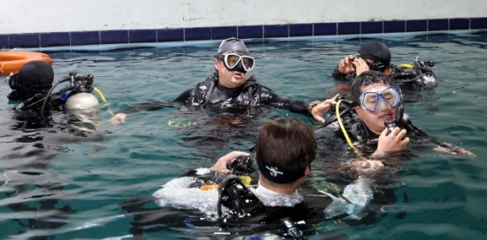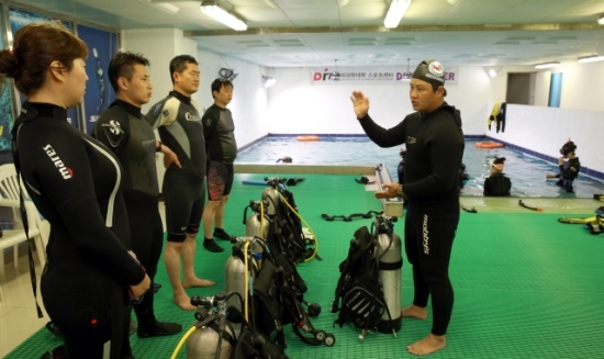 부산스쿠버아카데미(051-503-8896) 소속의 배혁록(36) 강사. 14년 경력의 전문 강사다. 이날 그에게 스쿠버 다이빙을 배우기 위해 모인 이가 여러 명이다. 이미 스쿠버 다이빙 경력 4년의 숙련자인 문 씨도 참관인 자격으로 함께 했다. 문 씨와 배 강사는 10여 년 전 인라인 스케이트 동호회에서 만나 호형호제하는 사이가 됐다.