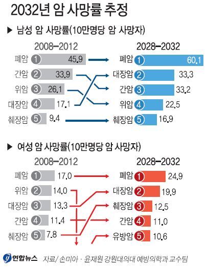 성별로 보면 남성은 전립선암, 여성은 난소암과 유방암 사망률이 높아진다. 반면 위암 사망률은 감소가 예상됐다.