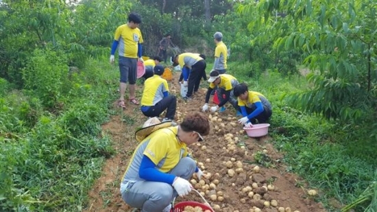 지사면 목평마을에서도 SK텔레콤 자회사인 NSOK서부본부(본부장 최원호) 임직원 15명이 참여,감자 수확이 한창인 주민의 경작지에서 일손을 보탰다.