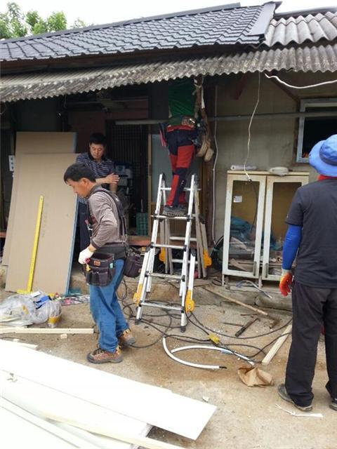 ▲ 수정봉회 회원들이 장애인 노부부의 집을 고치고 있다.