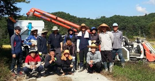 ▲ 농번기 일손돕기에 나선 ‘수정봉회’ 회원들이 기념 촬영을 하고 있다.