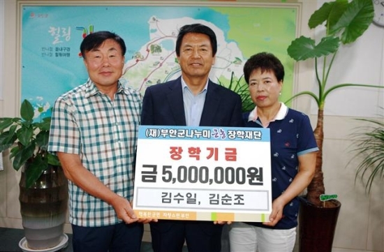 김수일·김순조 부부는 “부안군의 지역인재 양성을 위해 작은 금액이지만 보탬이 됐으면 한다”고 장학금 기탁 배경을 설명했다.