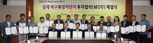 국내 최초 특장차 집적화단지인 김제 백구특장차단지에 입주를 확정한 17개 기업이 23일 김제시청 상황실에서 전북도와 김제시, (재)전북자동차기술원과 투자협약을 체결 하고 특장차산업의 대표주자가 될 것임을 다짐했다.