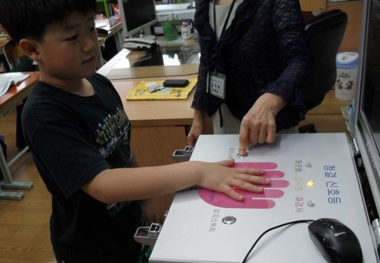 ▲ 일선 초등학교에서 손의 위생 상태를 확인하는 기계를 통해 개인 위생을 점검하고 있다.