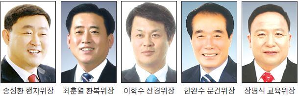 이날 선임된 상임위별 위원은 다음과 같다. △행정자치위=강병진·김종철·송성환·송지용·정호영·최영일·허남주 △환경복지위=국주영은·김대중·이도영·이성일·이호근·정호윤·최훈열 △산업경제위=강용구·김영배·김현철·박재만·백경태·양용호·이학수·이현숙 △문화건설안전위=박재완·양성빈·이상현·장학수·정진세·최은희·최진호·한완수 △교육위=강영수·양용모·이해숙·장명식·조병서·최영규·최인정