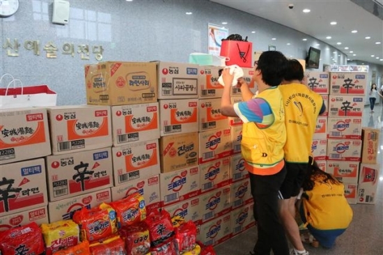 ▲ 지난 2일 열린 라면음악회에서 입장료로 받은 라면을 자원봉사자들이 차곡차곡 쌓고있다.