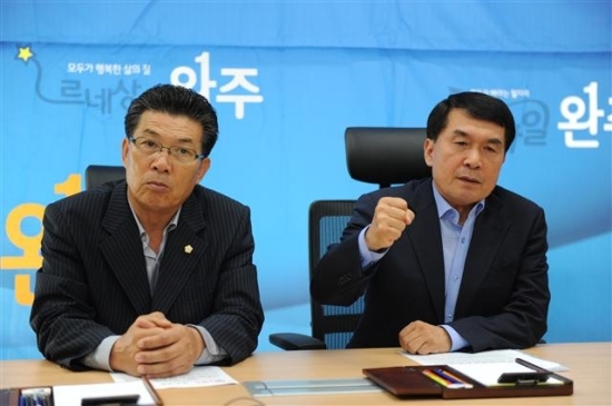 박 군수는 이날 정성모 군의회의장과 완주군민 반대대책위원회 정완철·송병주 공동대책위원장과 함께 군청기자실에서 기자간담회를 갖고 “어제 김승수 전주시장이 예상외로 완주군의 동의없이는 전주대대 이전을 추진하지 않겠다고 흔쾌히 수용했다”며 이 같이 전했다.