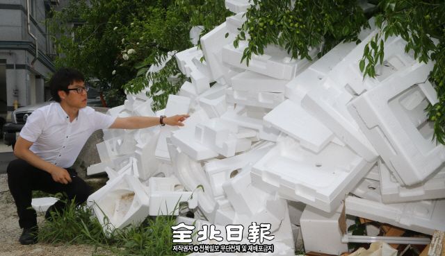전주시 효자동의 한 아파트에서는 폐 스티로폼 상자 수십 개가 어른 키 높이로 쓰레기 수거장 옆 인도에 쌓여 있었다. 일부는 한 집에서 배출한 듯 테이프와 끈 등으로 묶여져 있었고, 포장재와 접시 등 낱개로 된 스티로폼도 나뒹굴고 있었다.