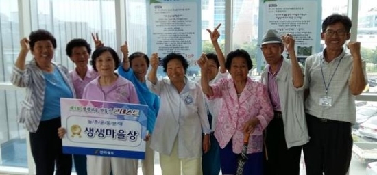 ▲ 임실읍 중금마을 할머니로 구성한 유랑극단이 제3회 생생마을 만들기 콘테스트에서 최우수상을 받은 뒤 기념 촬영을 하고 있다.