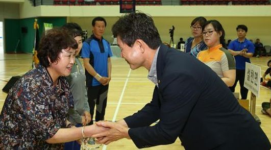 ▲ 지난 12일 무주국민체육센터에서 열린 무주군 새마을지도자대회에서 참석자들이 인사를 나누고 있다.