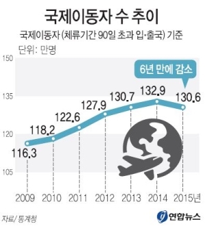 지난해 출국자는 62만2000명으로 2만9000명(4.8%) 증가했지만 입국자가 68만4000명으로 출국자 증가보다 더 큰 폭인 5만1000명(7.0%) 줄었다. 연합뉴스