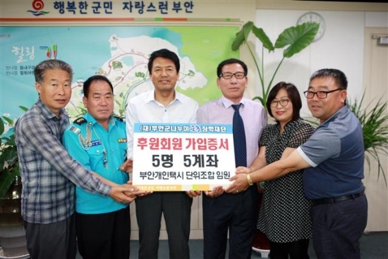 이와 함께 부안개인택시단위조합 김동석 조합장 등 임원 5명도 14일 부안군청을 찾아 김종규 이사장에게 나누미근농장학재단 정기 후원회원 가입서를 전달했다.