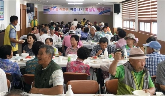 이날 주민자치위원회는 연지동주민센터 직원들과 함께 주민센터 2층에 행사장을 준비하고 어르신 200여명을 초청, 기념수건과 여름철 대표 보양음식인 닭죽을 제공했다.