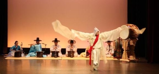 ▲ 승무 공연에 맞춰 전라삼현육각 보존회 회원들이 삼현육각을 연주하고 있다.
